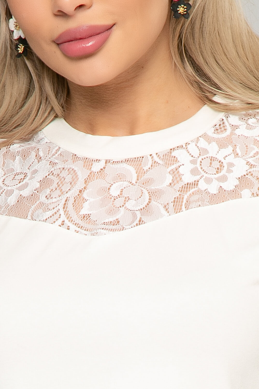 Трикотажная блуза с элементами, выполненными из эластичного гипюра в классическом оттенке. Такая модель будет гармонично смотреться в деловом образе, как самостоятельно, так и в качестве нижнего слоя под жакет или пиджак. Рукав втачной, укороченный, полностью выполнен из гипюра. Вырез горловины - округлый.