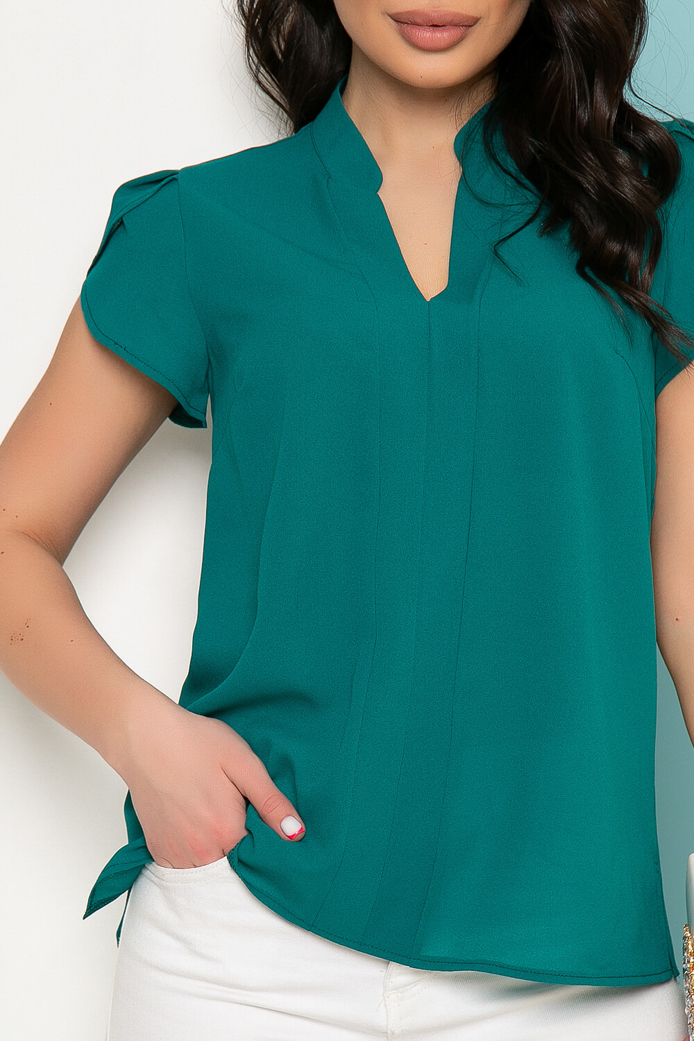 Классическая блуза в женственном исполнении - идеальный вариант на весенне-летний период. Украшением блузы является рукав, напоминающий по виду бутон цветка. Блуза прямого кроя, горловина оформлена стойкой. Рукав втачной, короткий. По боковым швам небольшие разрезы, низ ровный.