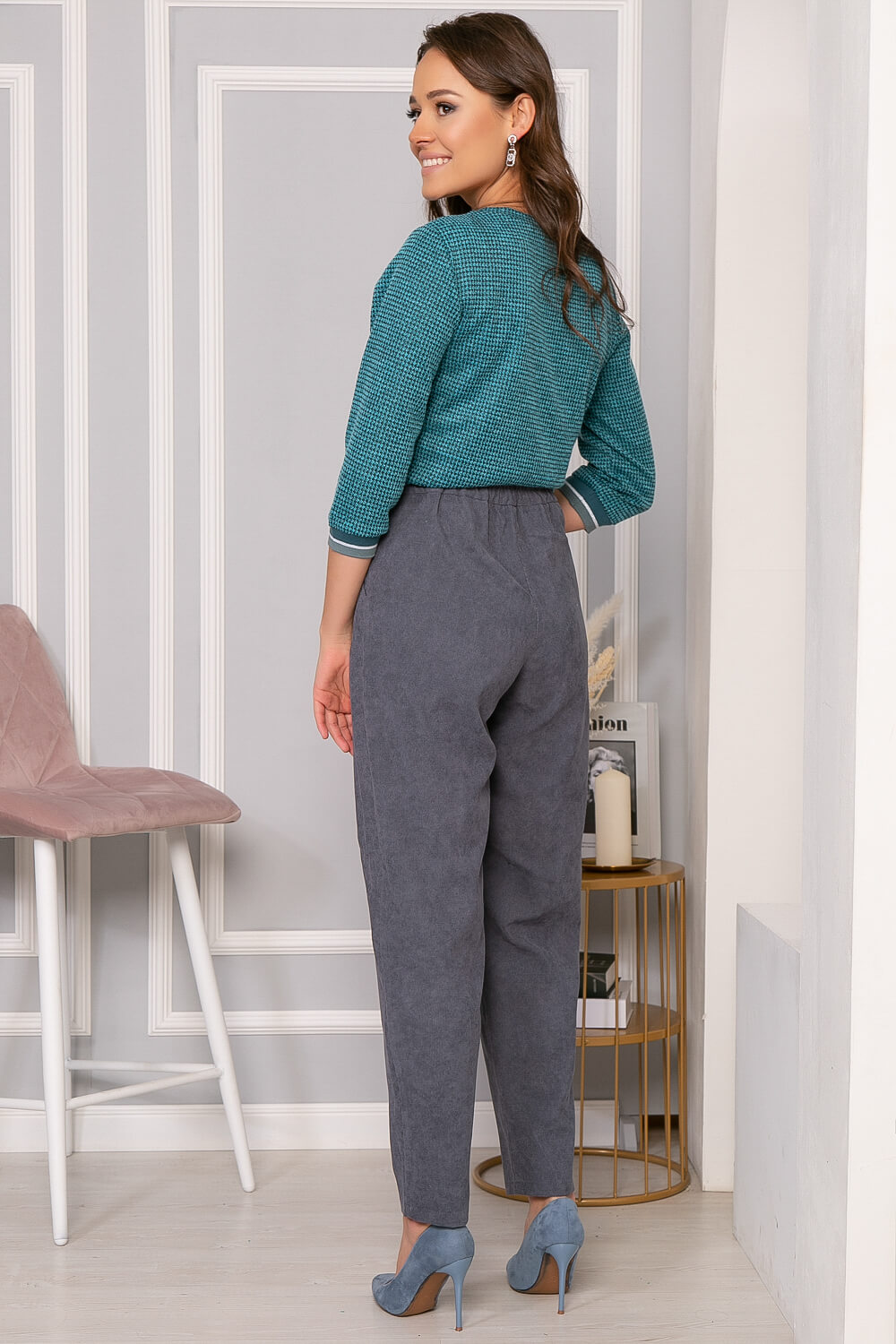 Брюки-бананы из вельвета для создания комфортного образа. Свободная форма брюк за счет складок на бедрах и сужения к низу создает модный женский силуэт. Брюки имеют карманы, по спинке пояс на резинке, обеспечивающий комфортное прилегание. Для создания экстравагантного образа сочетайте их с яркими джемперами. Тем, кто предпочитает классику, подойдут сочетания с изящными свитерами и кофтами.