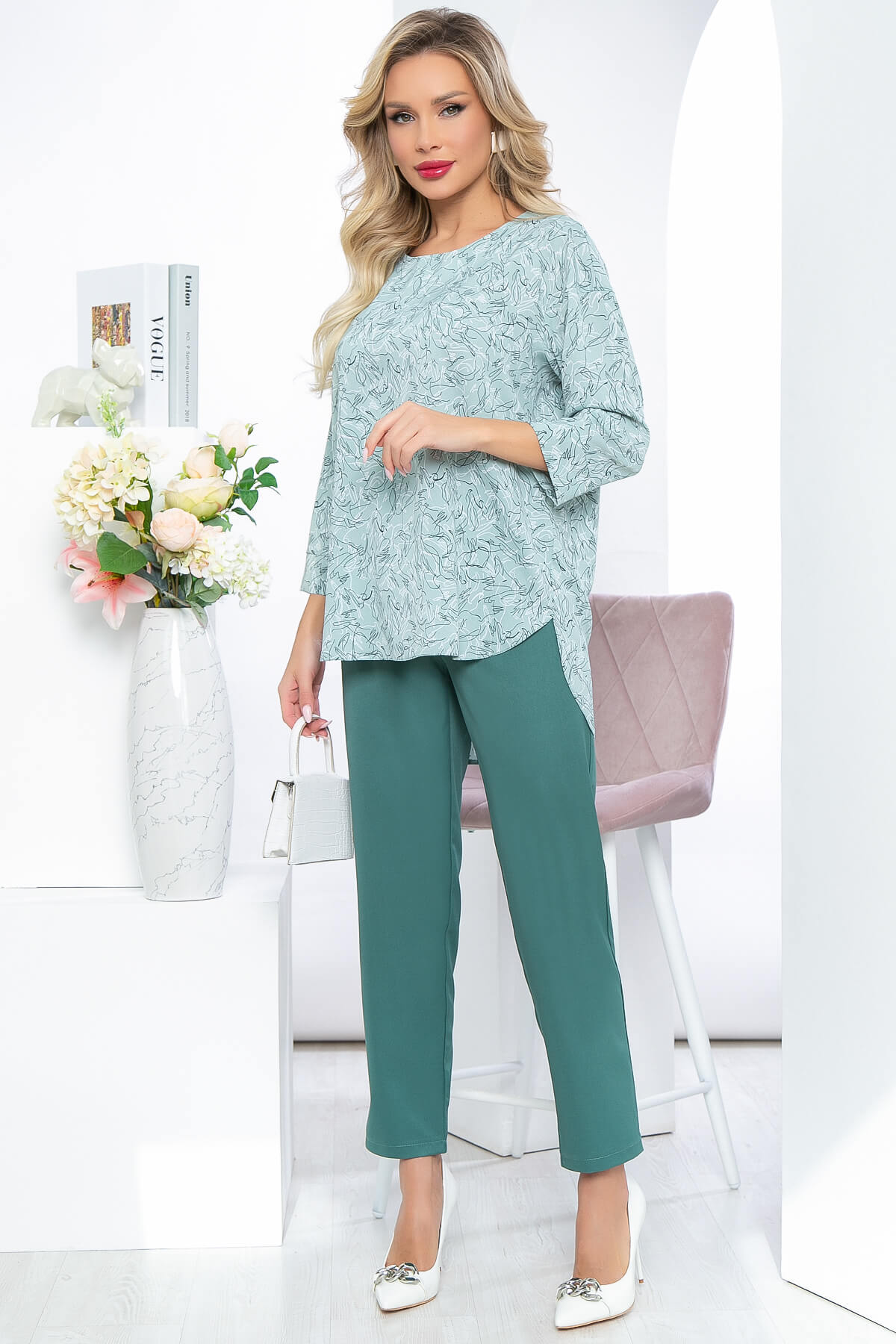 Элегантный костюм, состоящий из брюк с высокой посадкой на резинке и блузы свободного кроя с удлинённой спинкой. Очень женственный комплект в стильной флористической расцветке. Блуза свободного кроя, округлый вырез горловины, рукав три четверти, со спущенным плечевым швом. По боковым швам есть разрезы. В комплект входит пояс из основной ткани.