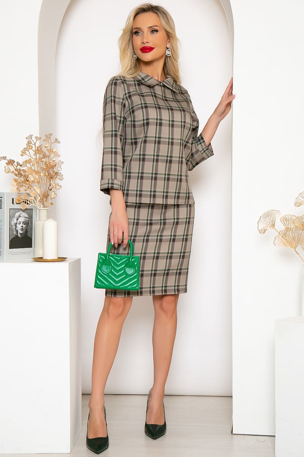 - Цвет: бежевый, принт: клетка (зеленый);