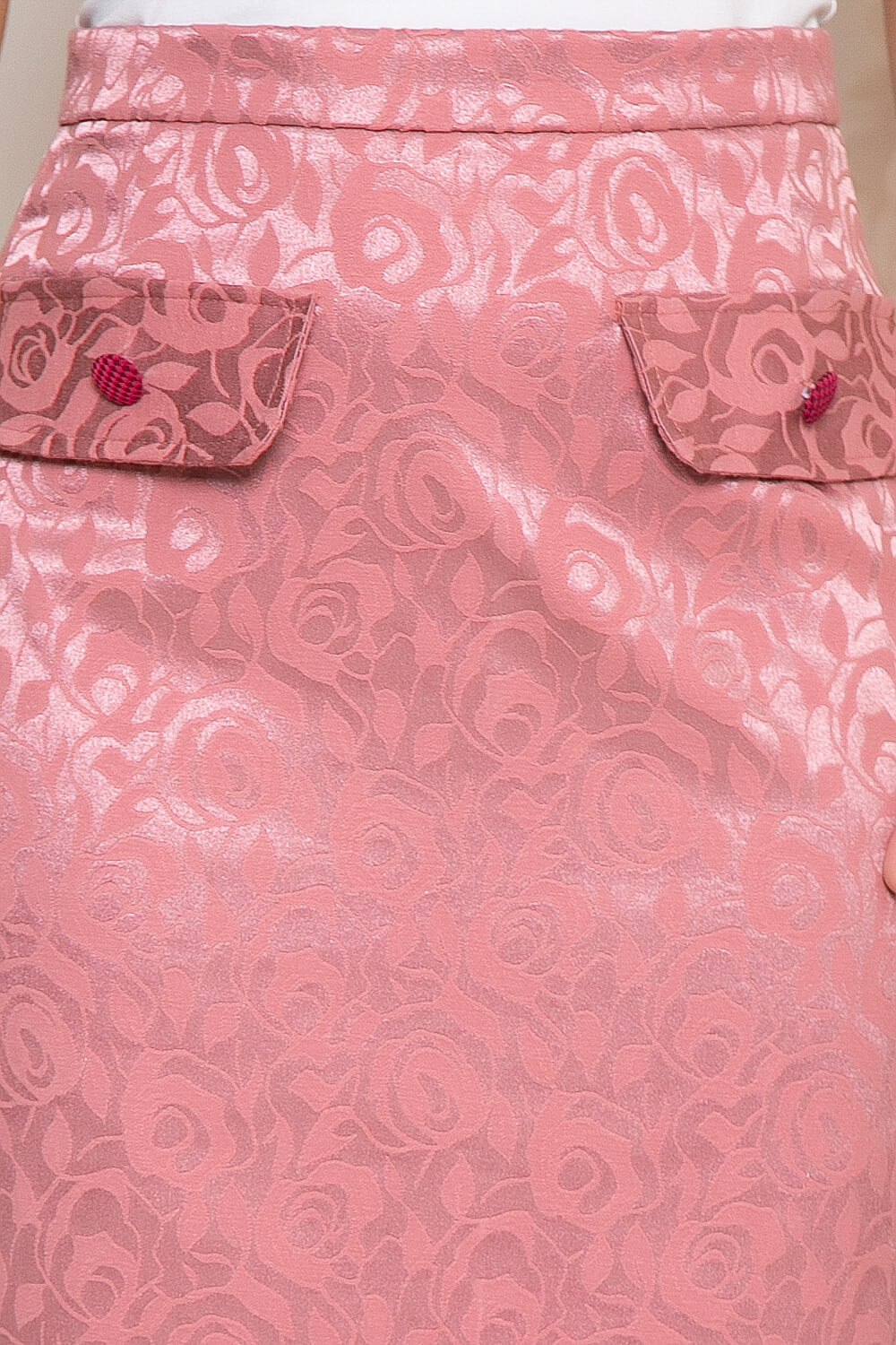 Юбка-карандаш в красивом розовом оттенке с узорами и имитацией карманов. Такая юбка создаст неповторимый элегантный образ и станет ярким акцентом в нём. Юбка на притачном поясе, по спинке застёгивается на молнию, сзади есть разрез.