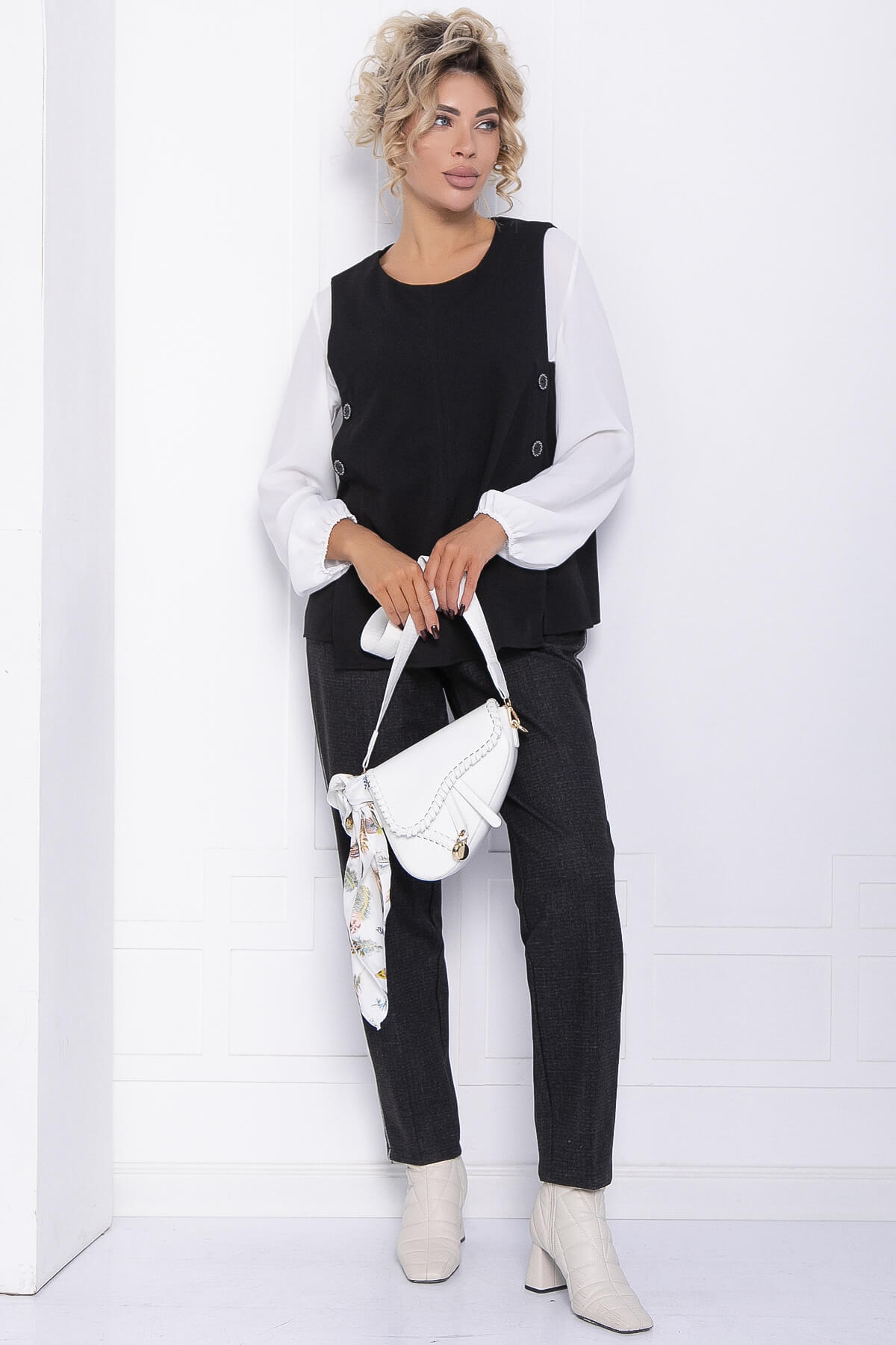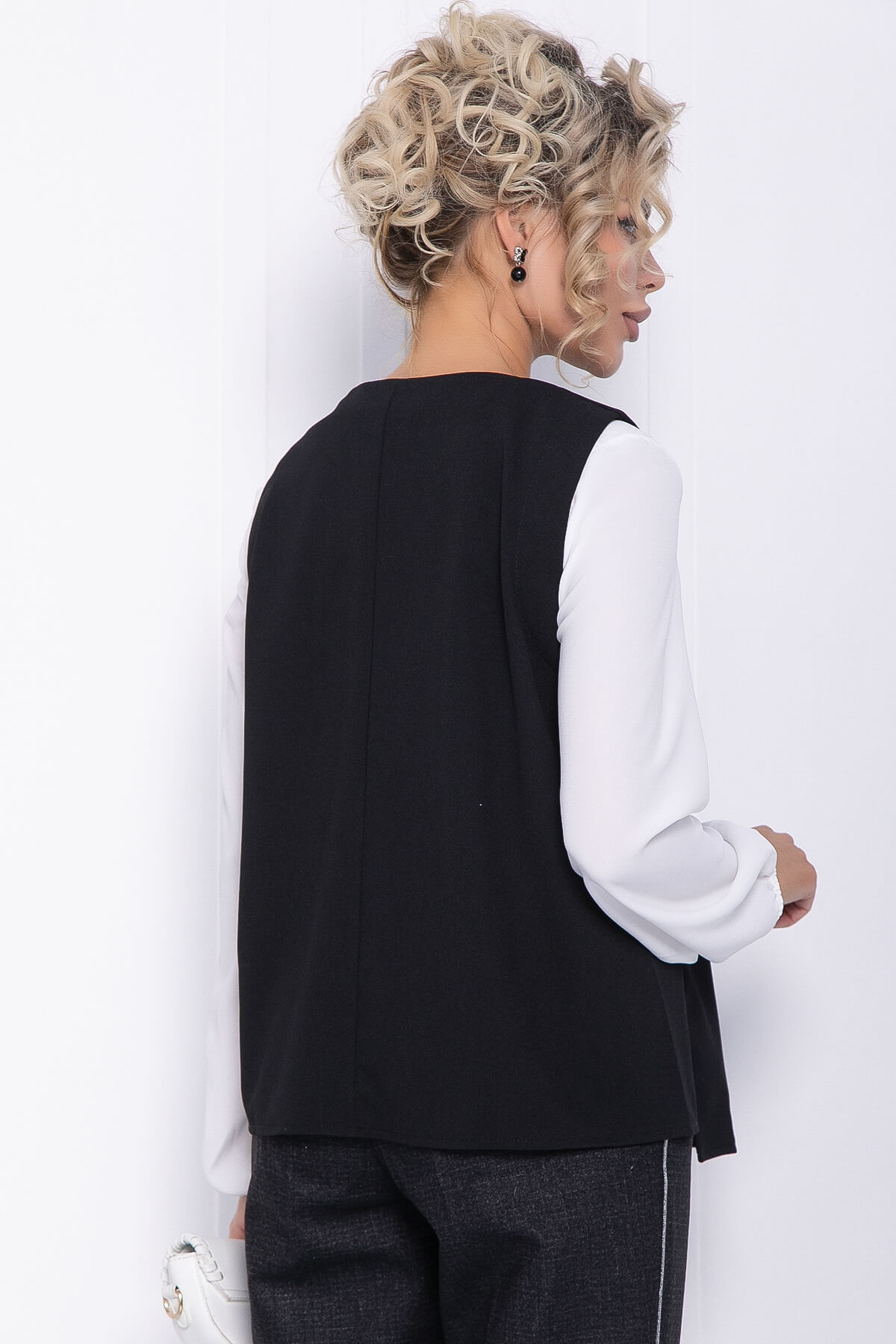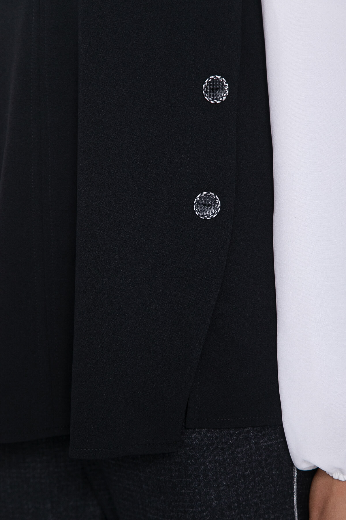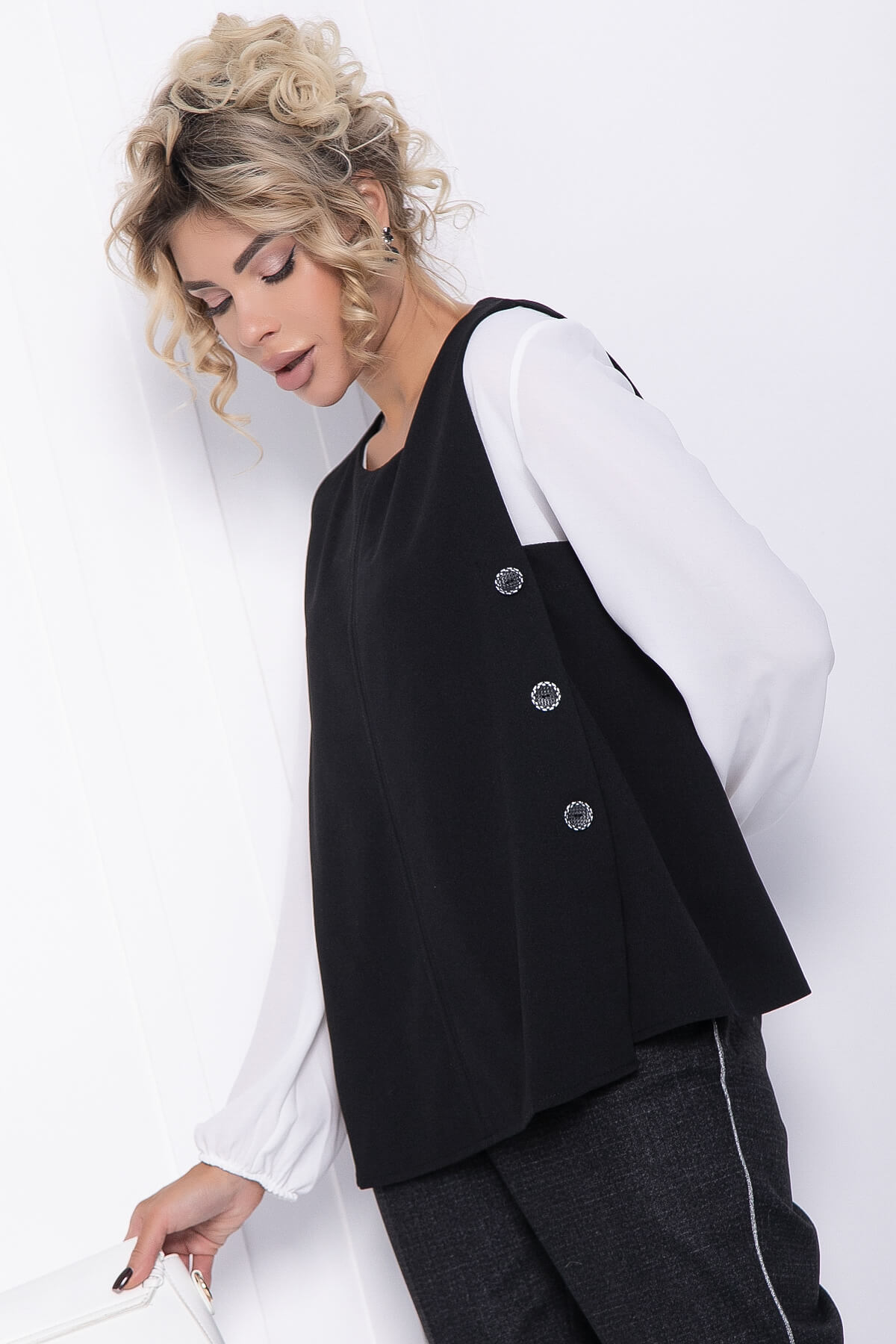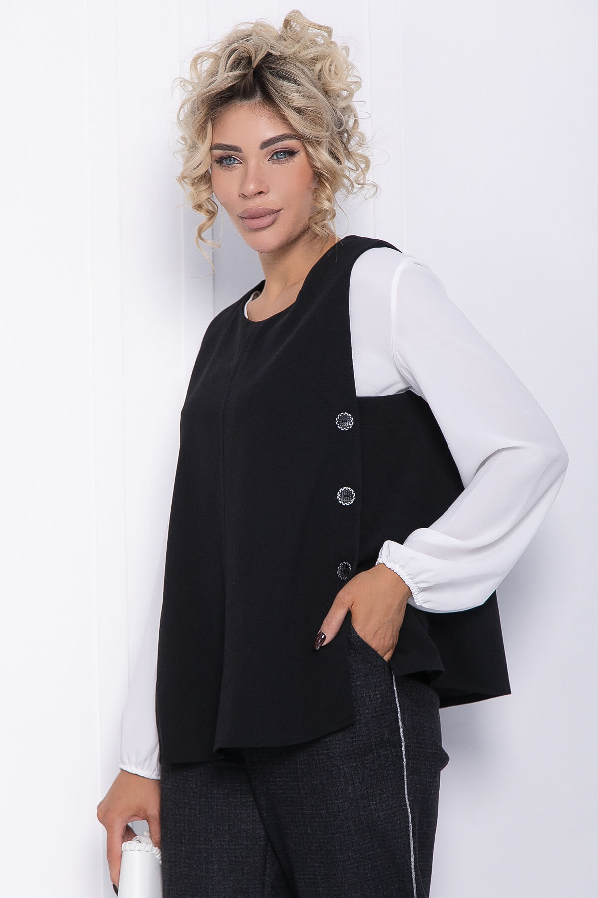 Жилет с декоративными пуговицами по бокам и округлым вырезом горловины подойдет как второй слой поверх блузы, водолазки или рубашки. Свободный крой делает ее подходящей для женщин и девушек с любым типом фигуры, также подойдет и для беременных. Имеет элегантный дизайн, прекрасно дополнит ваш гардероб, придавая образу особую изысканность.