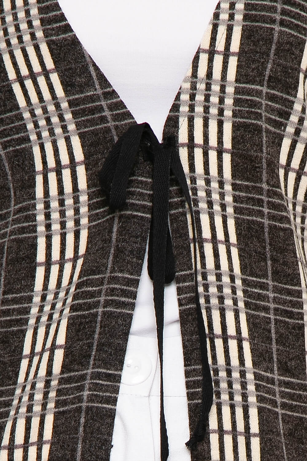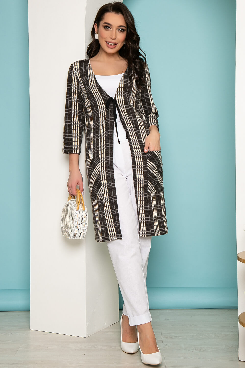 Трикотажный кардиган - идеальный верхний слой на весенне-летний период. Кардиган свободного кроя, по переду завязывается на завязки. Рукав втачной, три четверти. По переду кардигана есть накладные карманы.