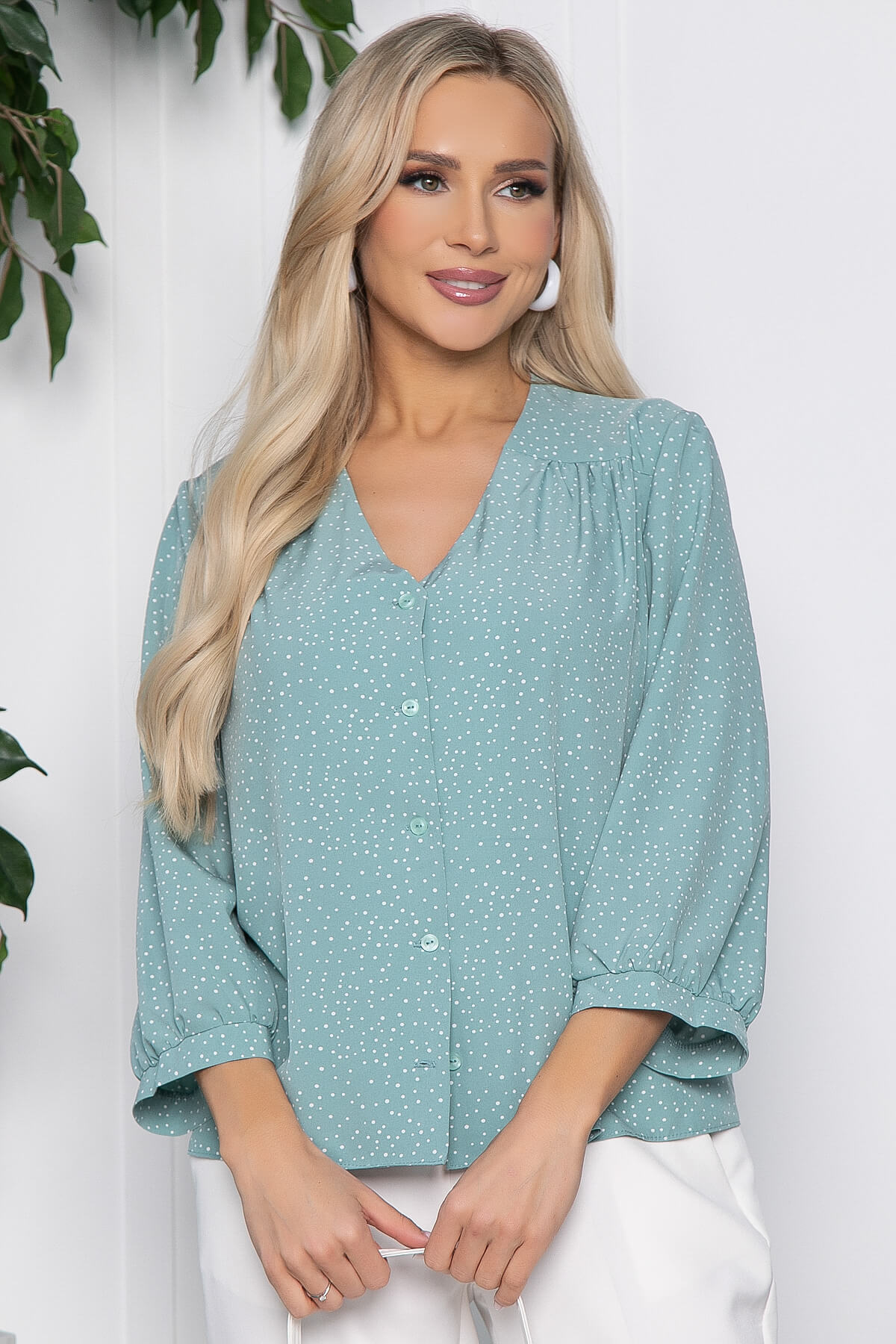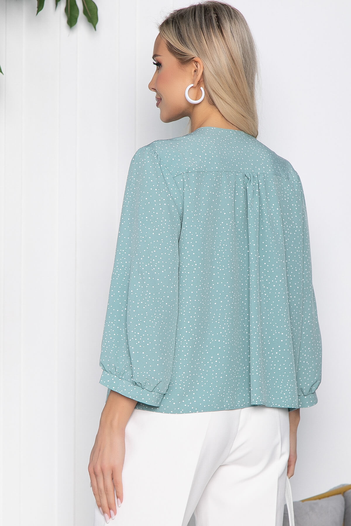 Модель с V-образным вырезом и принтом в горошек придает образу особый шарм и элегантность. Блуза будет удобна как офисная демисезонная одежда под пиджак или как летняя для повседневной носки.