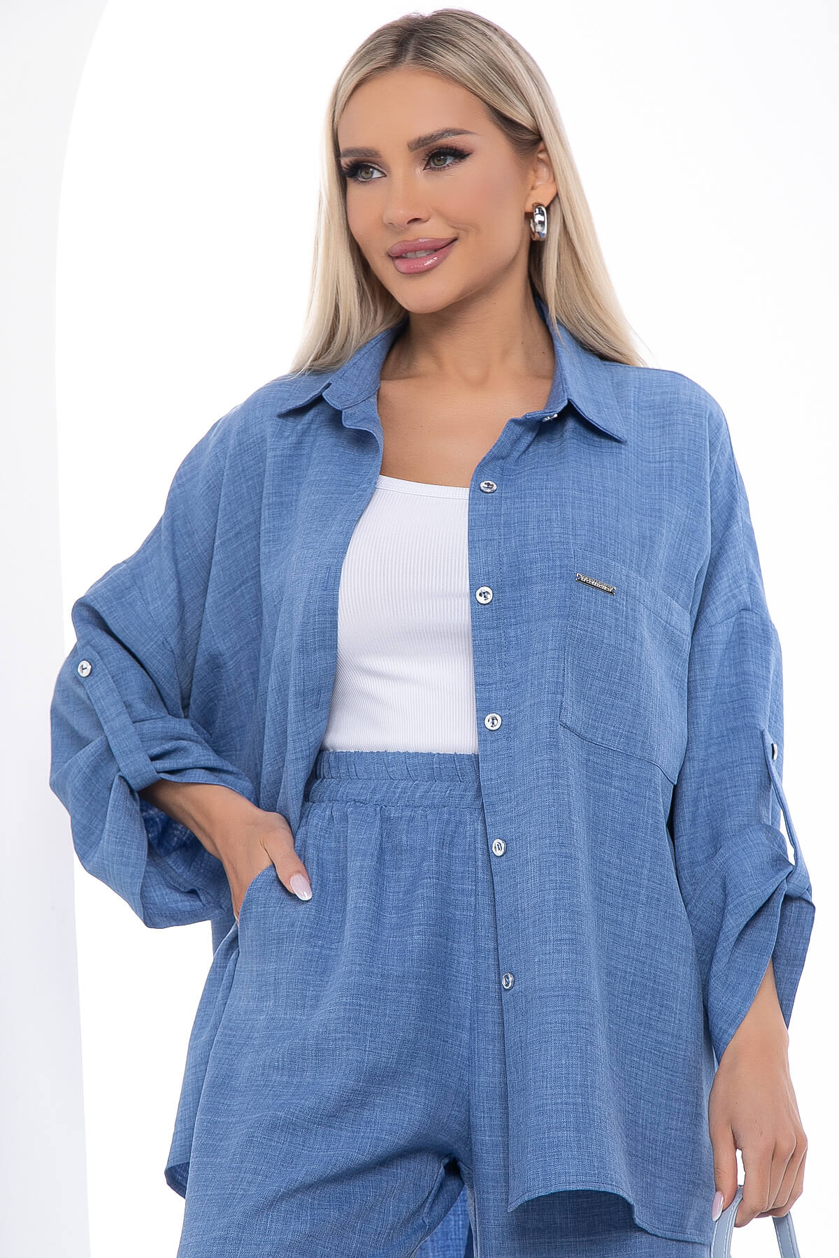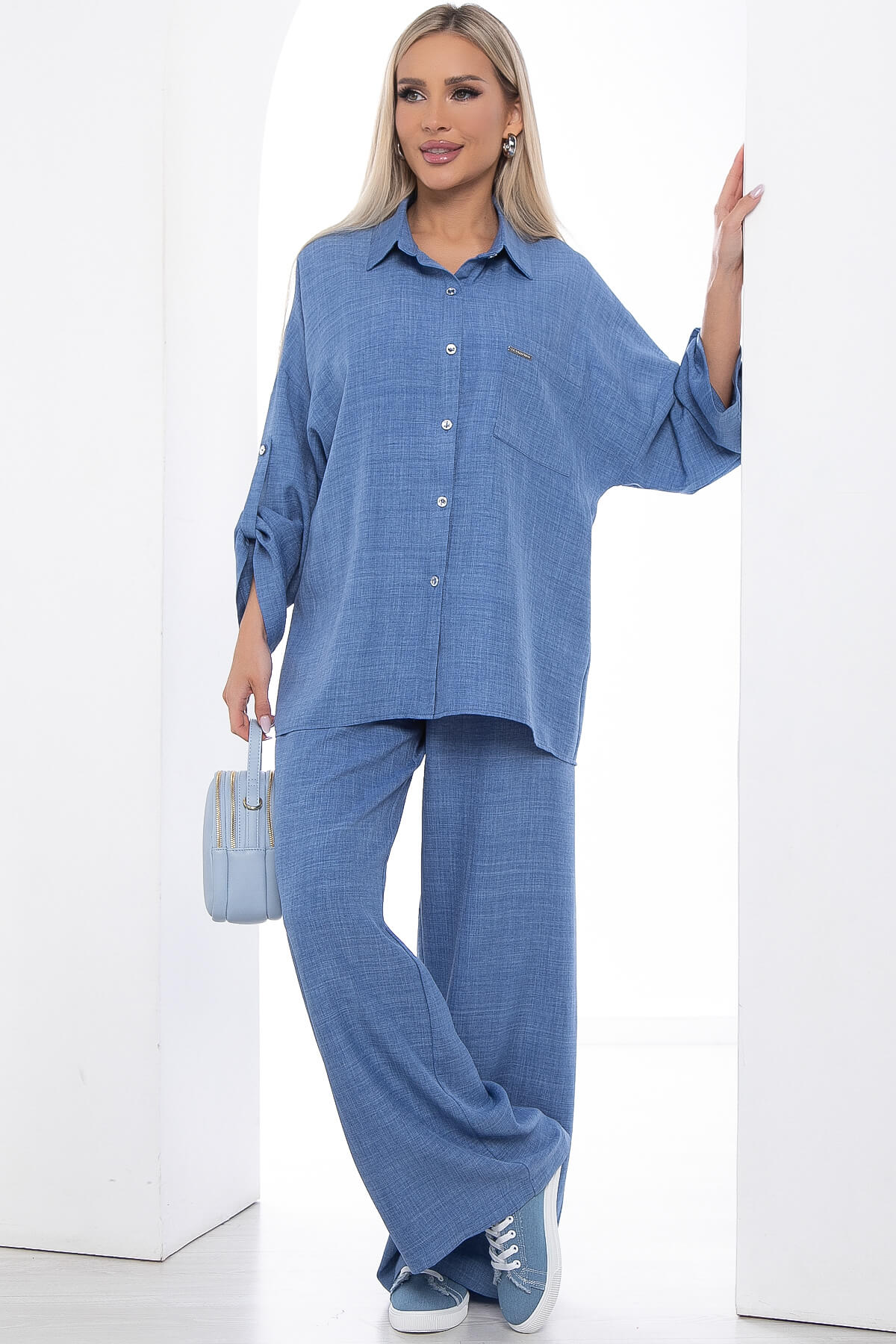 Костюм из лёгкой ткани идеально подойдёт для летнего расслабленного образа. Свободный крой не сковывает движений и дарит комфорт. Рукав длинный, собирается на пату. Спинка - акцентная деталь образа, скроена на запах.