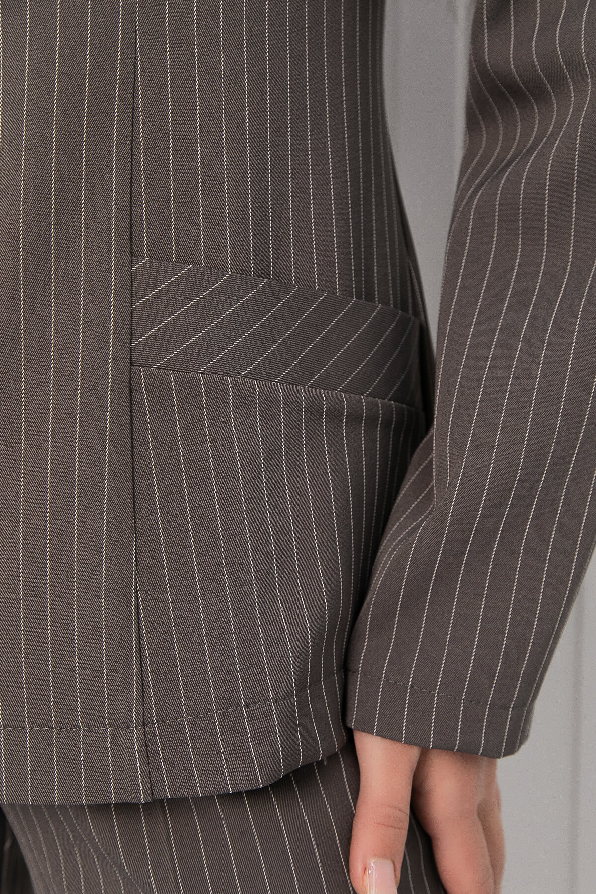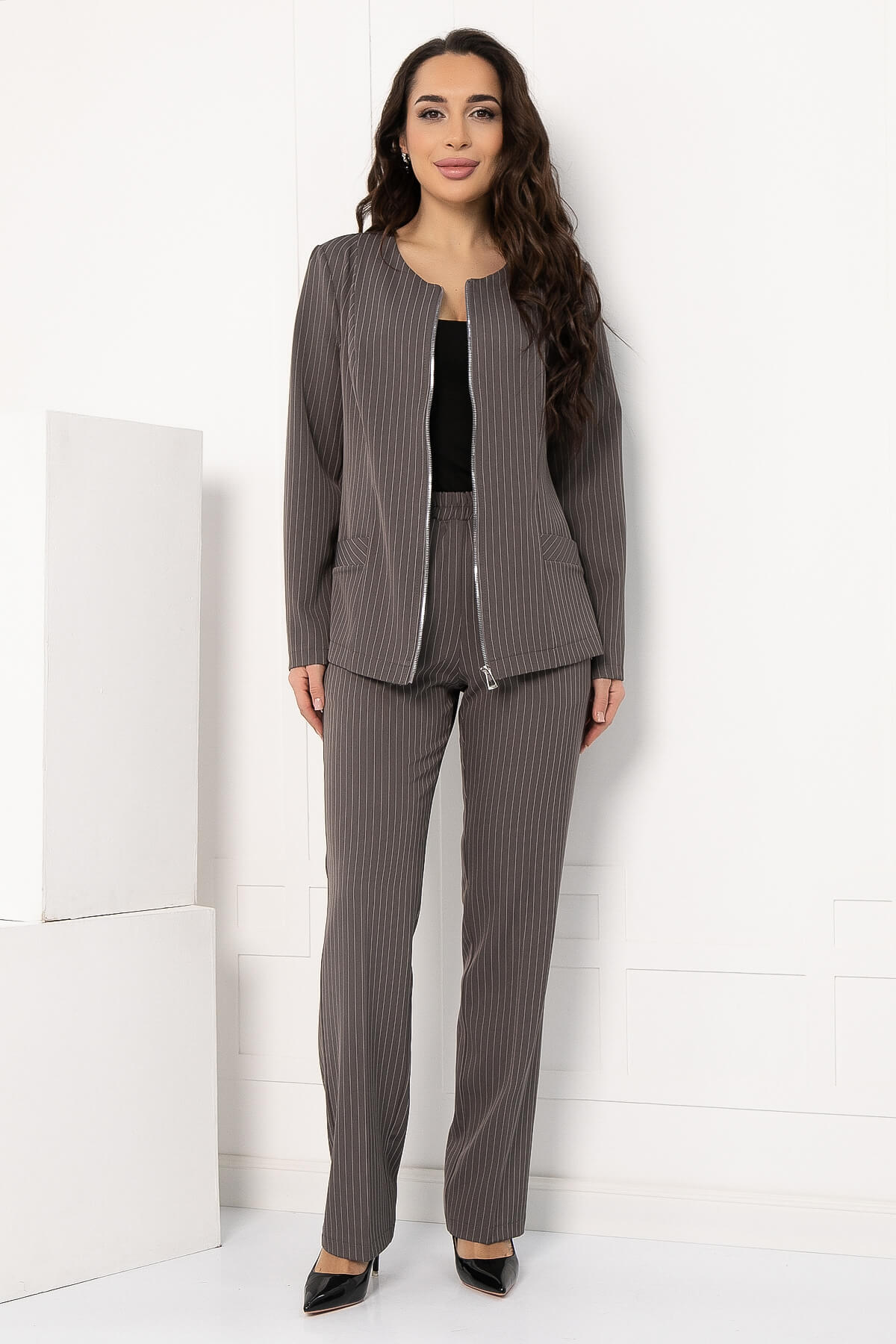 Стильный брючный костюм, сочетает в себе элегантность и комфорт, позволяя вам выглядеть уверенно в любой ситуации. Костюм-двойка выполнен в классическом стиле, актуальный для любого офиса, изюминкой которого является застежка на молнию. Элегантные линии подчеркивают фигуру, а строгий крой добавляет уверенности.