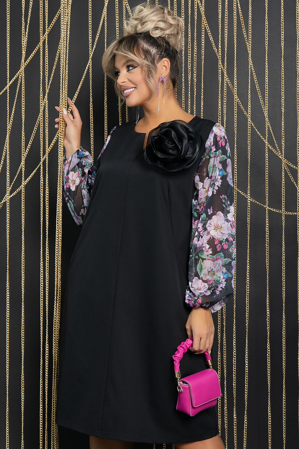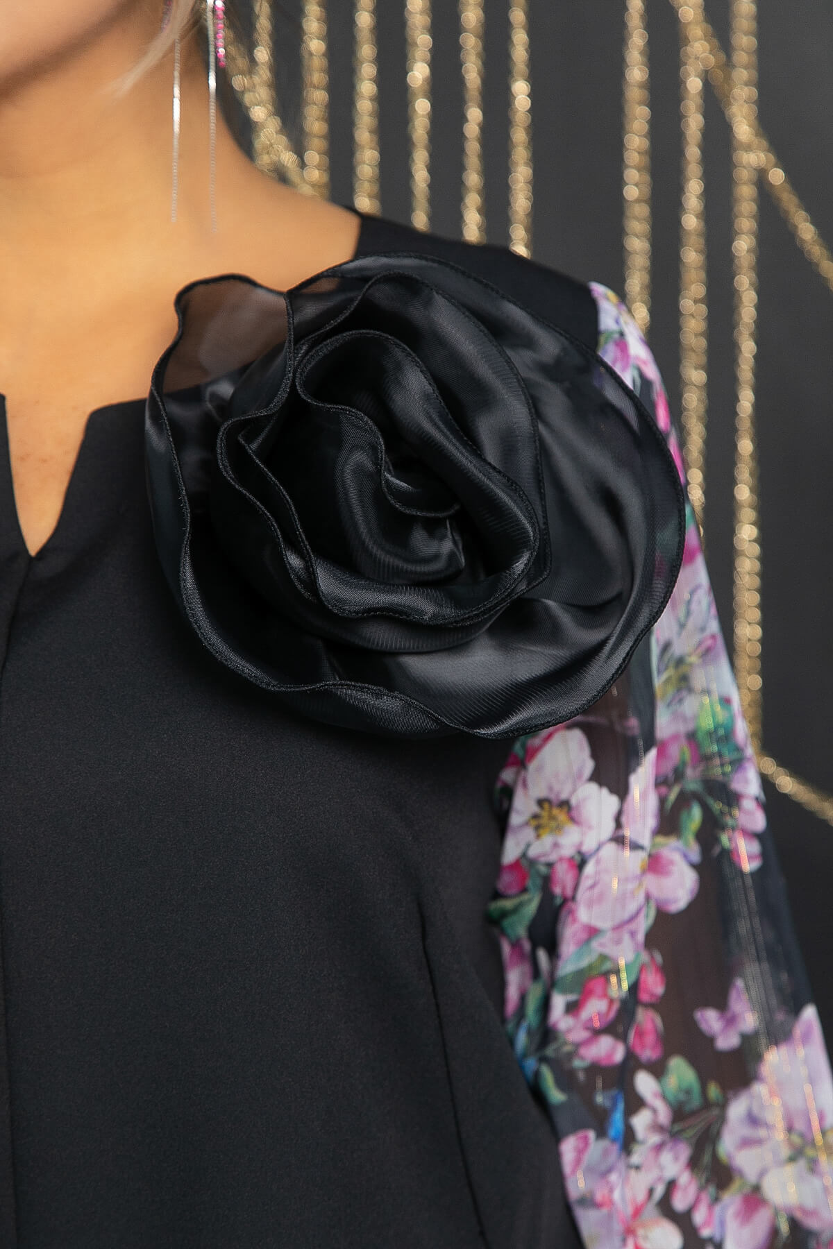 Свободное не сковывающее движение платье. Горловина округлой формы с V-образным вырезом, нагрудные вытачки переходящие в карманы, рукав длинный из шифона на резинке. Потойная молния по спинке. Украшает платье большая черная роза на груди.