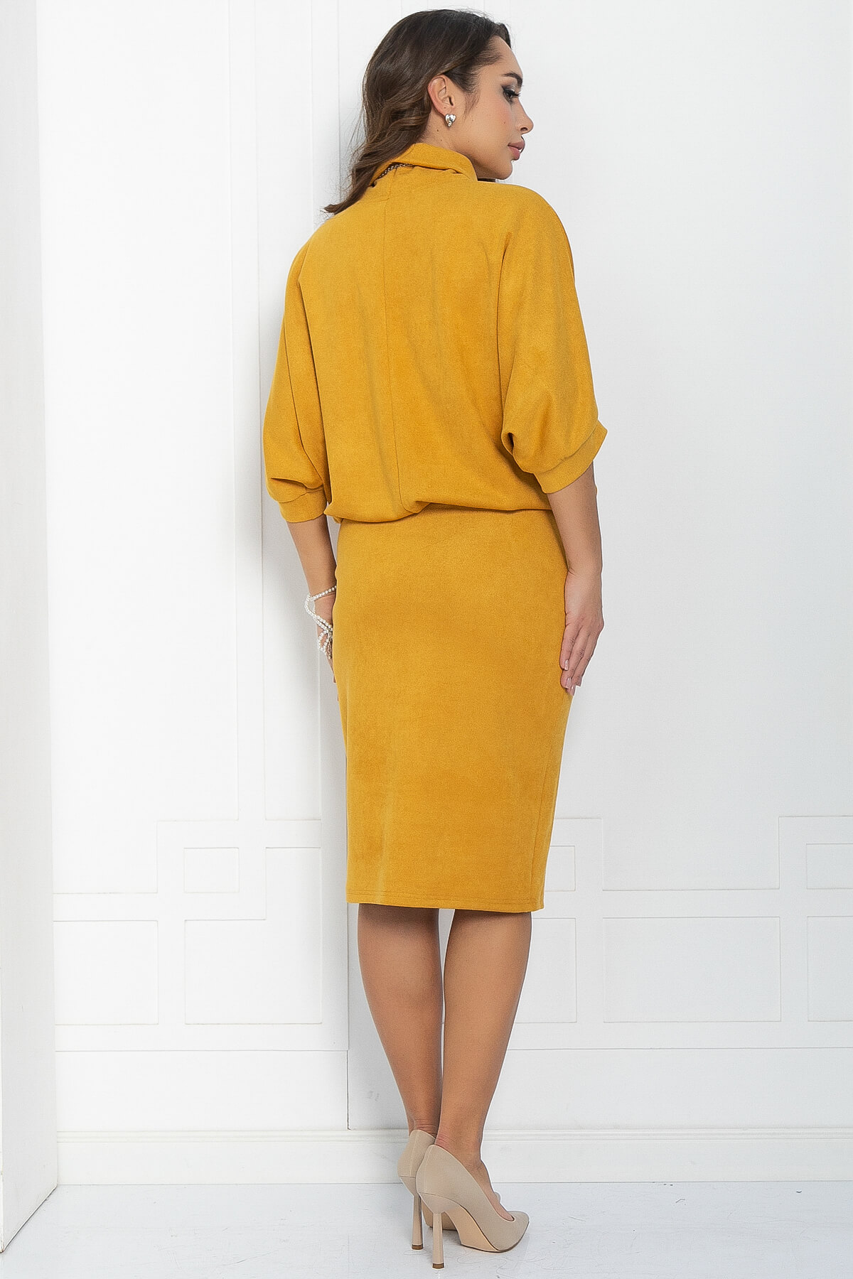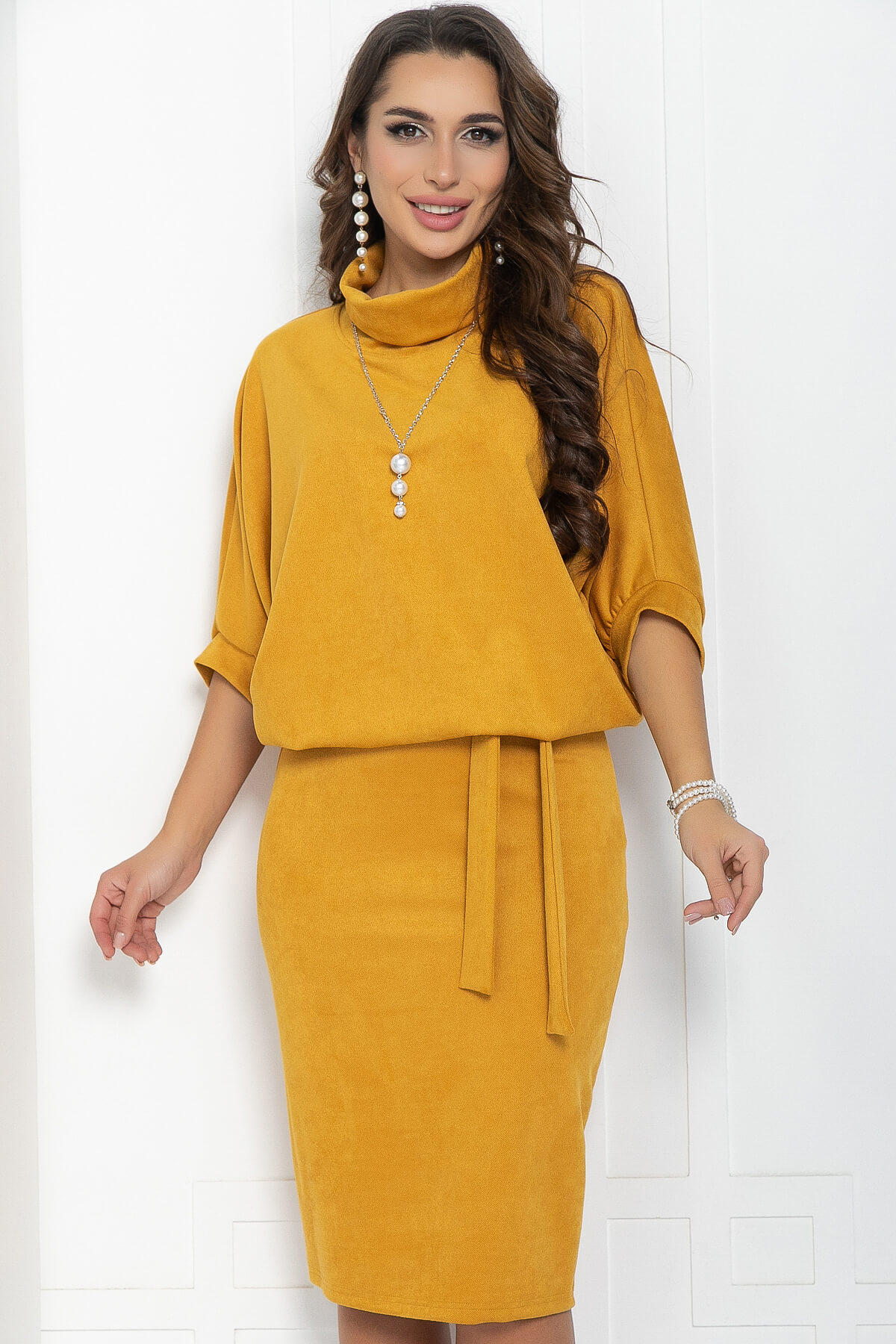 Платье из плотного трикотажа в красивом горчичном оттенке. Элегантная юбка, прилегающего силуэта, подчеркнёт красоту женской фигуры и визуально вытянет силуэт, а свободный верх не будет сковывать движений. Платье прекрасно подойдёт в качестве повседневного варианта и будет хорошо сочетаться как с туфлями или ботильонами, так и с кроссовками или ботинками. Благодаря своему фасону платье прекрасно справляется с задачей скрыть небольшие недостатки фигуры и подчеркнуть достоинства. Пояс из основной ткани и украшение входят в комплект.