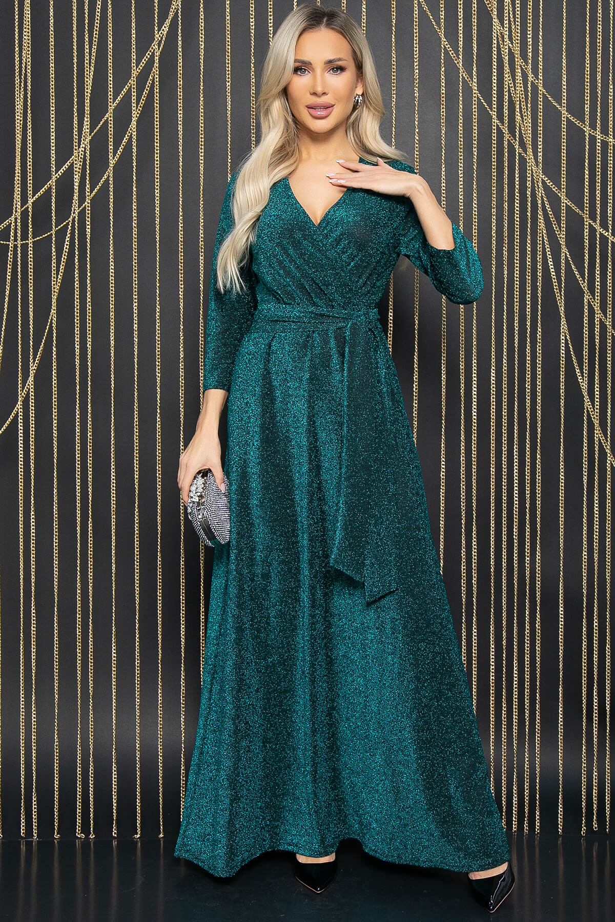 Платье с блестящим люрексом — это идеальный выбор для любого торжественного мероприятия! Оно создаст незабываемый образ и привлечёт внимание окружающих. Изящный V-образный вырез подчеркивает линию декольте, а пояс акцентирует талию, добавляя вашей фигуре утончённости и грациозности. Верхняя часть платья выполнена на запах, что создаёт романтичный силуэт. Юбка платья плавно расширяется к низу, что придаёт вашему образу динамичность и женственность. В этом платье вы будете блистать на любом мероприятии, будь то вечерние гулянья или новогодняя вечеринка. Талия отрезная.